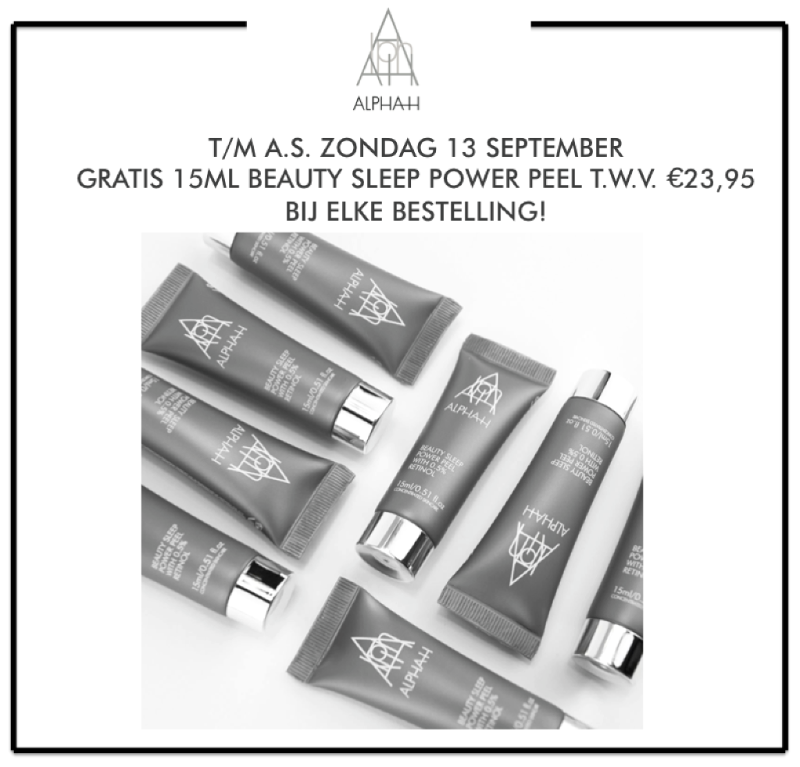 Alpha-H Beauty Sleep Power Peel is vanaf 29 september te koop bij Alpha-H.nl. Voor wie niet zo lang kan wachten is er nu een leuke kennismakingsactie; tot en met zondag 13 september geeft Alpha-H gratis een 15 ml Beauty Sleep Power Peel t.w.v. € 23,95 bij elke bestelling. OP = OP.