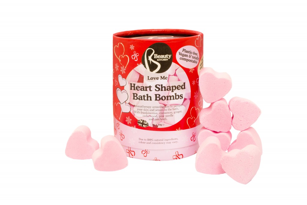 Feestelijke roze hartjes voor een bruisend bad dat heerlijk geurt naar essentiële oliën van frankincense, kaneel, kruidnagel en dennen, in een duurzame kartonnen verpakking die 100% recyclable is. Consumentenadviesprijs: € 11,00.