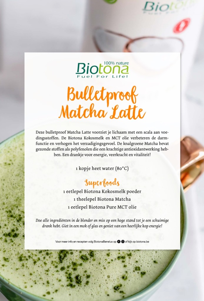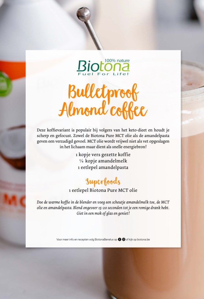 Ik ben fan van het merk Biotona en drink dagelijks een matcha latte met de matcha thee van Biotona. Inmiddels heb ik deze MCT olie toegevoegd aan mijn dagelijkse routine. Een keer per dag maak ik koffie met opgeklopte sojamelk en daar voeg ik een eetlepel Biotona MCT olie aan toe. Aan de olie zit verder geen smaak, maar geeft wel een fluweelzachte textuur. Koffie met deze olie staat bekend als Bulletproof Coffee en is heel populair bij volgers van het keto-dieet. Het geeft je voor een lange tijd een verzadigd gevoel zodat je geen lekkere trek krijgt. Aan het einde van deze blogpost deel ik nog twee recepten van Biotona voor een Bulletproof Almond Coffee en Bulletproof Matcha Latte.