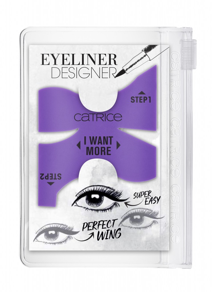 Perfecte symmetrie. Flexibel siliconen sjabloontje dat zich aanpast aan elke oogvorm – voor het perfect aanbrengen van je eyeliner! Consumentenadviesprijs € 2,59.