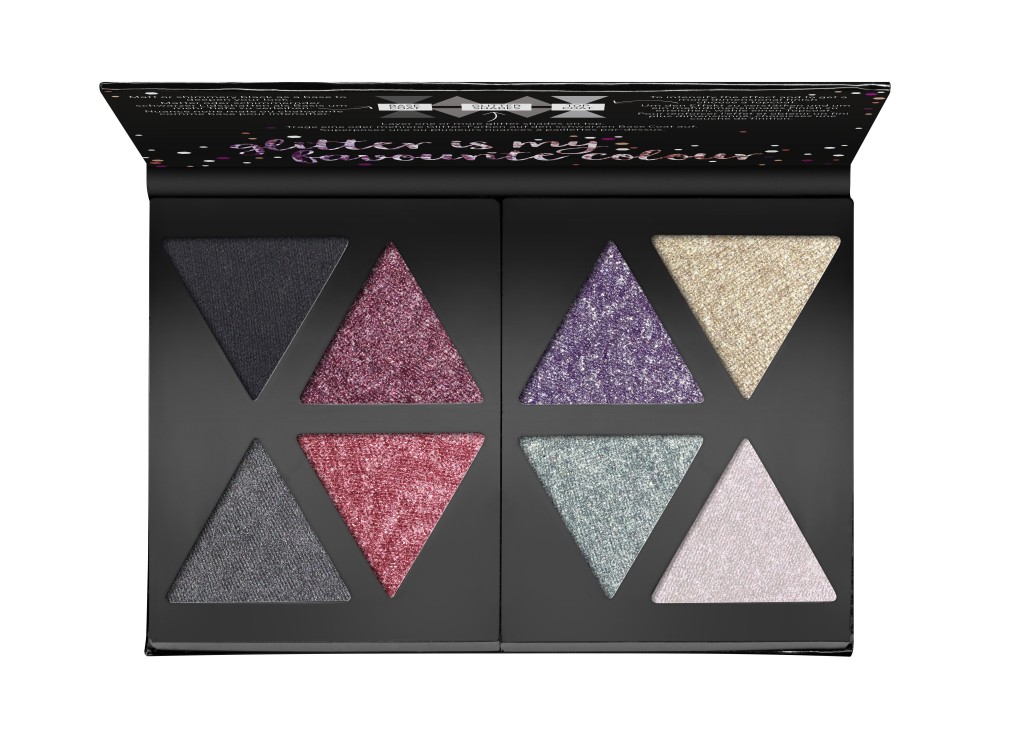 Mix n’ match palet met twee zwarte basiskleuren in mat en parelmoer, vier intens glinsterende statement kleuren met hoge dekking en twee toppers met holo effect. Allemaal in één palet! Consumentenadviesprijs € 6,99.
