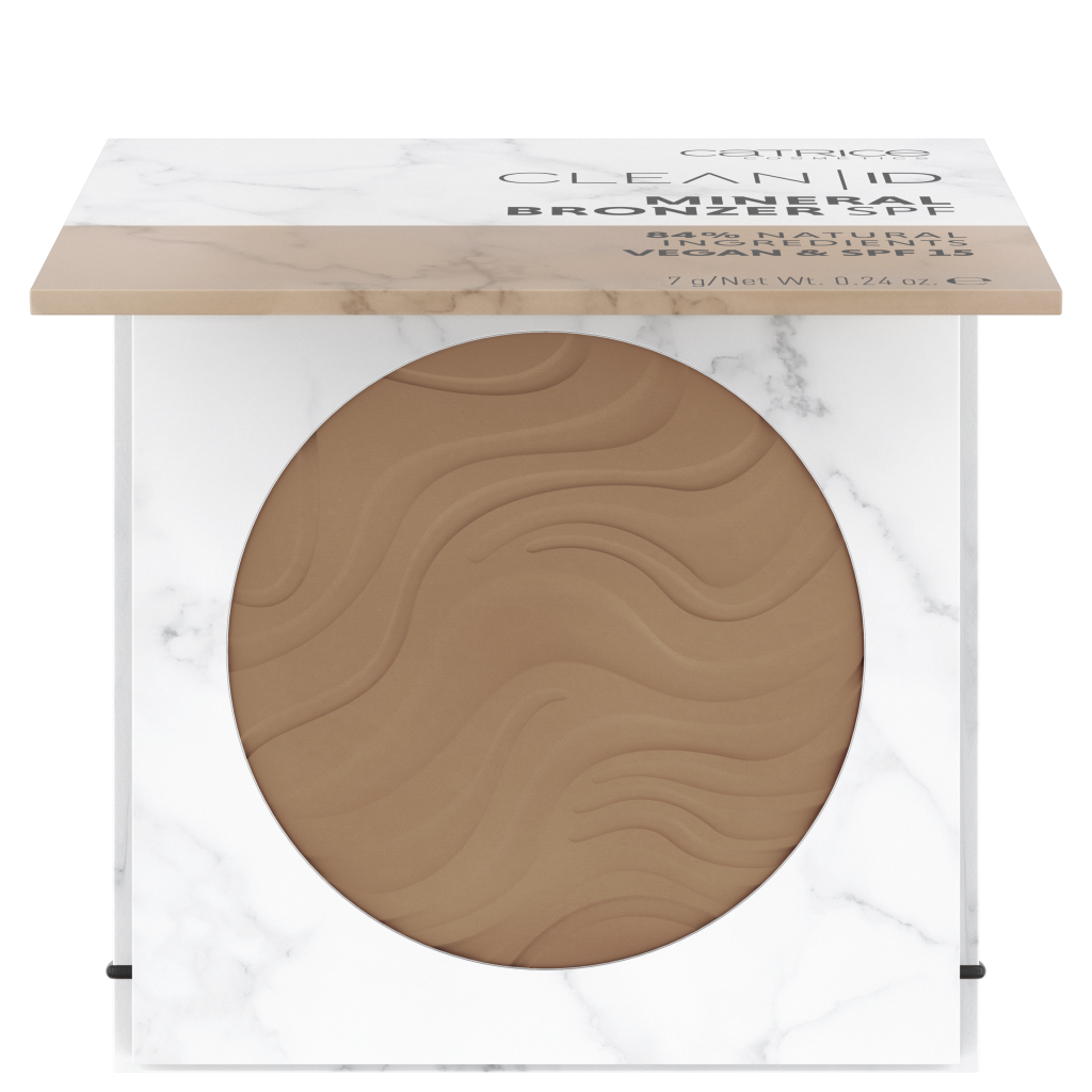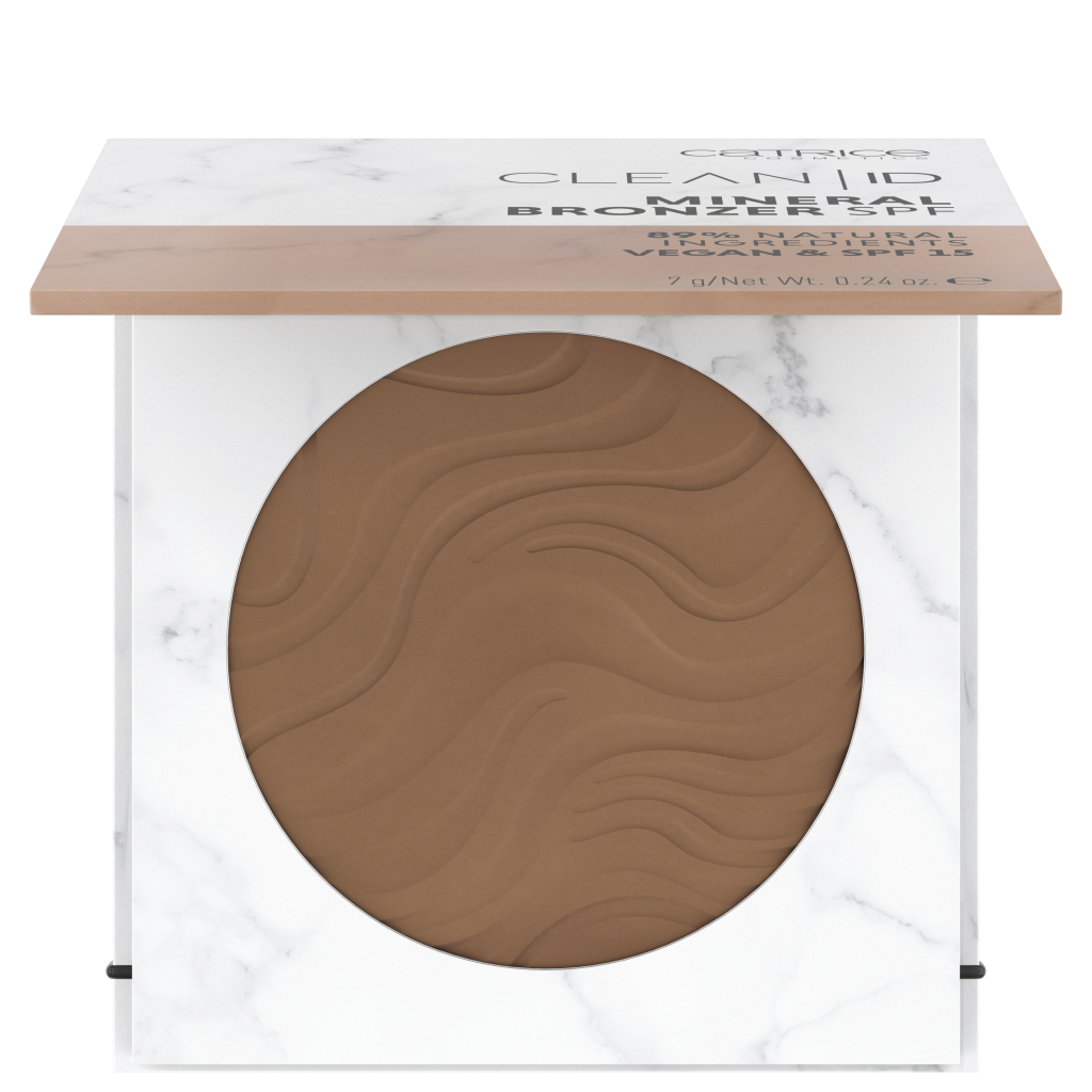 CLEAN ID – MINERAL BRONZER SPF Een feel good product voor de huid. De geperste textuur is talkvrij en gemaakt van 90% natuurlijke ingrediënten. Op de huid geeft het poeder een fluweelzacht soft touch gevoel. Het is de eerste CATRICE bronzer met SPF 15. En het belangrijkste: hij geeft je gezicht een mooie sunkissed look. Adviesprijs € 4,99