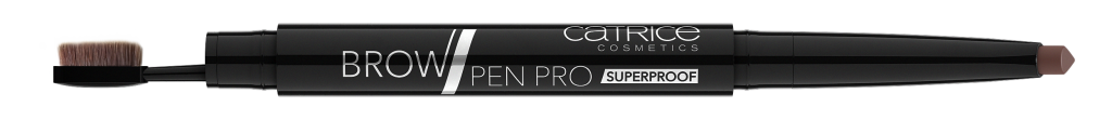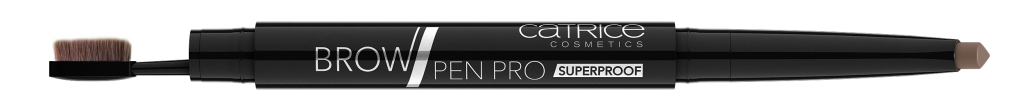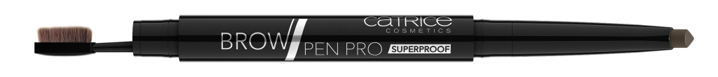 BROW PEN PRO SUPERPROOF: Dit water- en sportproof wenkbrauwproduct kan elke uitdaging aan. De driehoekige punt helpt je de waxtextuur nauwkeurig aan te brengen, de smalle, geïntegreerde kabuki borstel blend de kleur op zachte wijze over de wenkbrauwen. Adviesprijs € 3,99