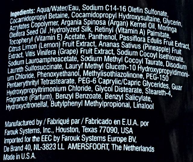 In deze shampoo zit helaas een flinke hoeveelheid Sodium C14-16 olefin sulfonate in (een soort zeep wat je haar te agressief reinigt), zie hier meer tekst en uitleg over dit ingrediënt in mijn review van de CHI Infra Shampoo. Verder is de shampoo wel sulfaat en parabenen vrij.