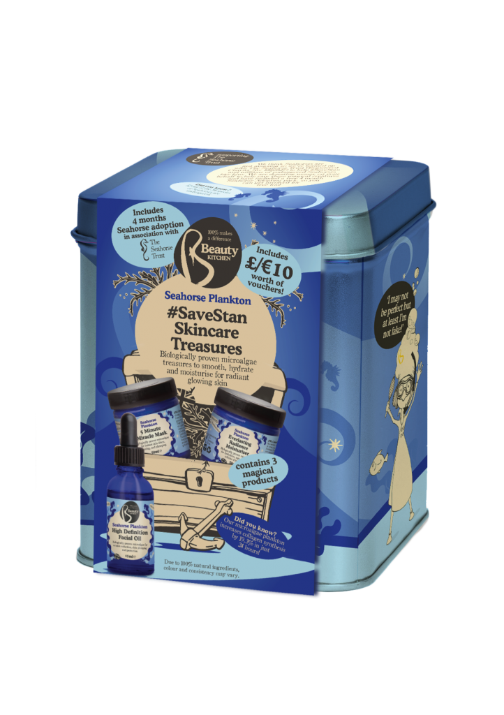 This “Seahorse Plankton #SaveStan Skincare Treasures”, is a gift that gives you a good feeling because you not only donate a great skin care set, but at the same time supports the Seahorse Trust by adopting a seahorse for 4 months (Seahorse Trust membership in the package). Did you know there are 54 species of sea horses? Because most of them are threatened, the Seahorse Trust works hard to protect these beautiful animals from extinction! Seahorse Plankton #SaveStan Skincare Treasures contains three Seahorse Plankton top products for your skin: High Definition Facial Oil (15ml), Everlasting Radiance Moisturizer (50ml) and 5 Minute Miracle Mask (50ml). The Seahorse Trust sends you regular updates about the adopted seaport.