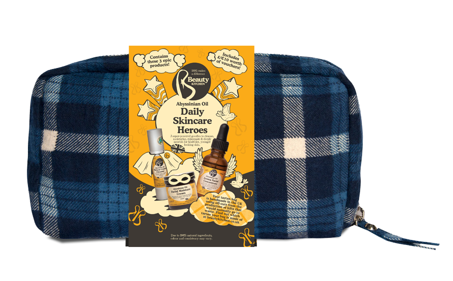 These “Abyssinian Oil Daily Skincare Heroes” are handmade toilet bags containing Abyssinian Oil skin care, made of unique materials! Remaining Tartan dust from the workplace of the oldest Scottish kilt makers in the world.