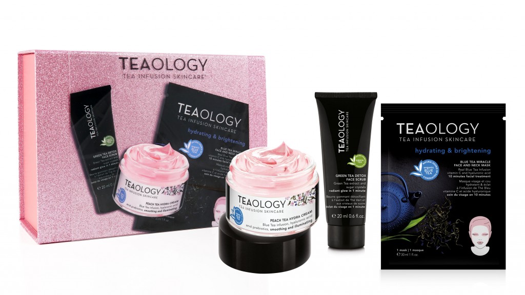 De Hydrating & Glowing Beauty Routine set (€ 43,95) bevat een Peach Tea Hydra Cream, een gratis Green Tea Detox Face Scrub en een gratis Blue Tea Miracle Face and Neck Mask.