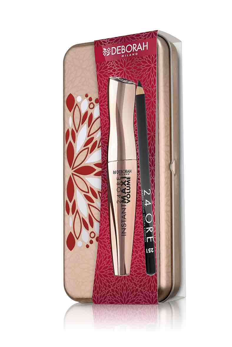 De Deborah Instant Maxi Volume mascara set (€ 11,95) bestaat uit De Instant Maxi Volume mascara en het 24 Ore oogpotlood.