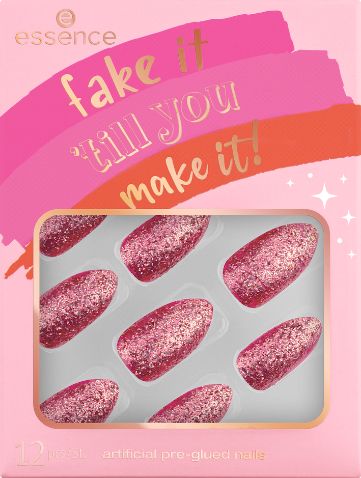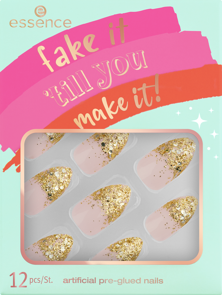 De kunstnagels in de essence fake it ’till you make it! Trend Edition zijn verkrijgbaar in vijf verschillende designs. Van delicaat roze met een holografisch effect, all-over glitter en spiraalvormige patronen in felle kleuren tot nude kunstnagels met grafische lijnen of gouden glitter op de rand van de nagel. Iedereen vindt gegarandeerd zijn favoriete look hier. Zin om alle designs uit te proberen? Geen probleem dankzij de ontzettend makkelijke applicatie!