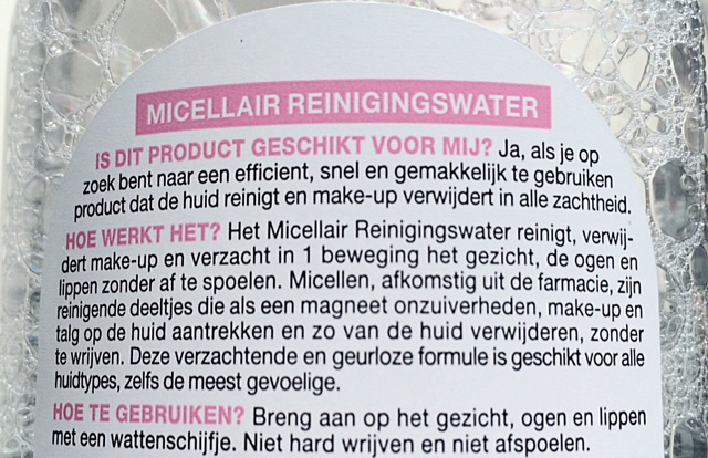 Micellair reinigingswater is een reiniging, zoals de naam al doet vermoeden, op waterbasis. In het reinigingswater zitten Micellen, dit zijn reinigende deeltjes die als een soort magneet al het vuil en make-up op je huid verwijderen, doordat de Micellen zich aan het vuil en make-up op je huid hechten hoef je niet te wrijven. Breng micellair reinigingswater aan op een wattenschijfje en ga er mee over je gezicht zonder dat je hierbij wrijft en spoel het niet af.