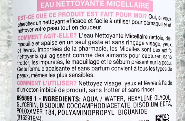 De ingrediënten zijn exact hetzelfde als de fles met de roze dop, alleen bevat dit micellair reinigingswater ook alcohol.