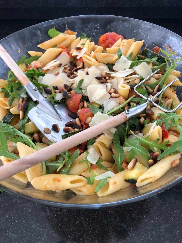 • Verdeel wat rucola over de borden en schep hier de pastasalade op.