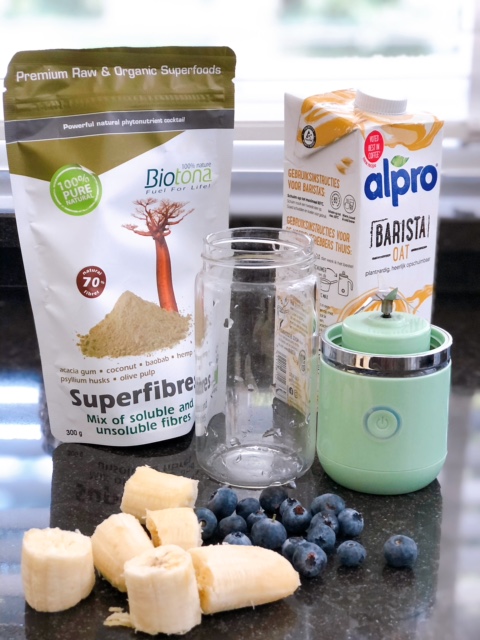 Mijn persoonlijke favoriete recept met Biotona Superfibres, vooral omdat het snel klaar is en ook nog eens super lekker is. Gebruik een blender of een kleine portable blender, doe er 1 banaan, een handvol blauwe bessen, 1 eetlepel Biotona Superfibres en havermelk in. Mix dit alles tot een gladde smoothie, enjoy!