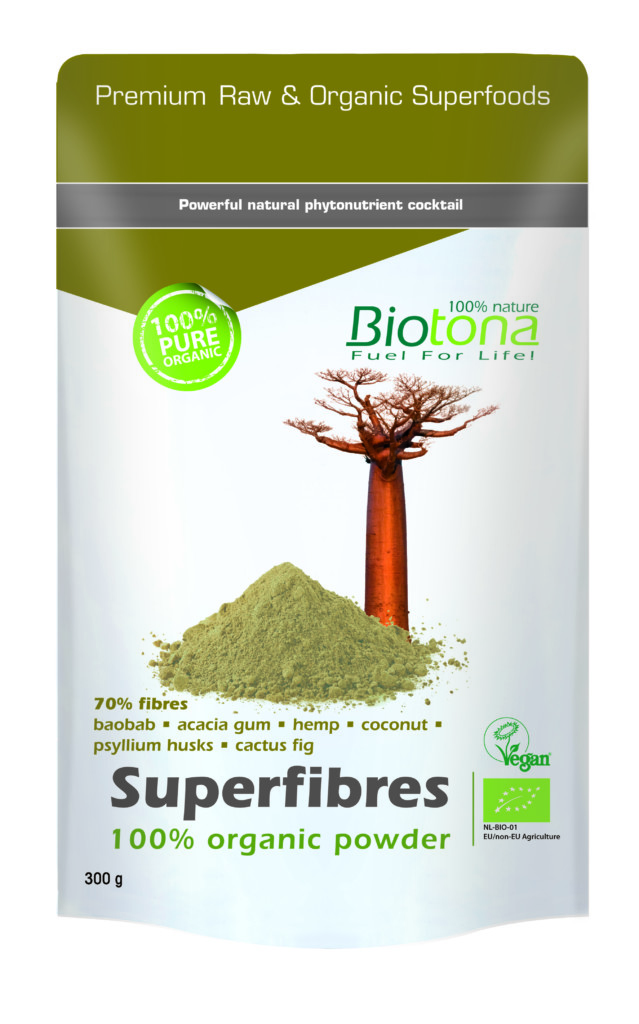 Biotona Superfibres bestaat grotendeels uit oplosbare voedingsvezels uit de gom van de Acacia senegalboom. Daarnaast bevat het poeder onoplosbare vezels uit kokosbloem, olijf en hennepzaad. Ook bevat de mix gedroogde vruchtenpulp van de Afrikaanse baobabboom, met oplosbare én onoplosbare voedingsvezels, vitaminen, mineralen en talrijke fytonutriënten.