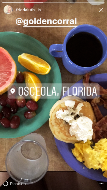Vrijdagavond kwamen we aan op ons bestemming. Nog snel wat boodschappen gehaald en redelijk vroeg ons mandje in. Het is 6 uur vroeger in dit deel van Amerika, dus voor ons biologische klokje waren we al tot diep in de nacht aan het doorhalen ;). De volgende ochtend (0700 Amerikaanse tijd wakker) gingen we ontbijten bij Golden Corral, een buffetrestaurant waar je kunt ontbijten, lunchen en dineren. Golden Corral Buffet and Grill Restaurants zijn populair in Amerika, veel eten voor een leuke prijs. Je vindt er lokale bevolking, maar natuurlijk ook toeristen en dan vooral de Snowbirds en Canadezen. Ik nam een typisch Amerikaans ontbijt met bacon, ei en pancakes met slagroom. Om al dat ongezonde voedsel een beetje te compenseren, ook nog wat fruit ;).