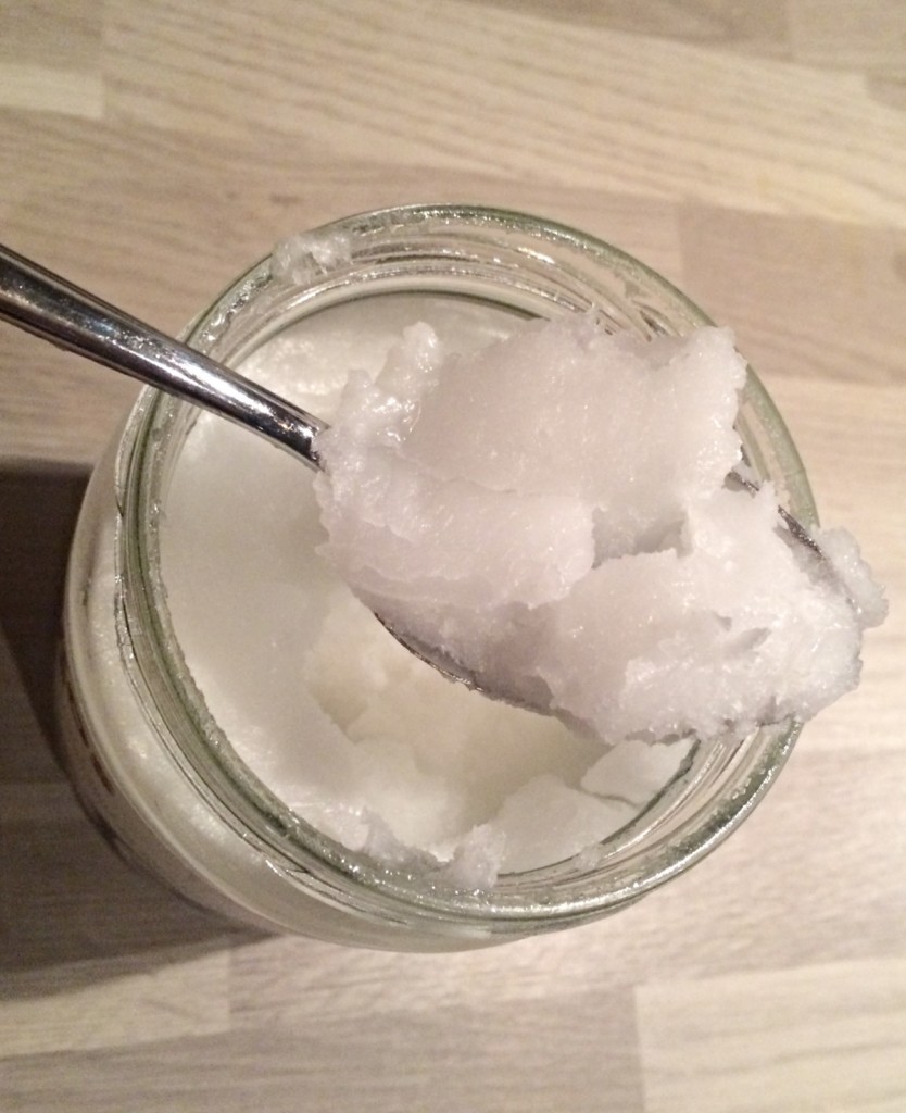 - Meng wat zeezout of suiker door de kokosolie (als je wondjes hebt door bijvoorbeeld scheren kun je beter gaan voor suiker, zout prikt).