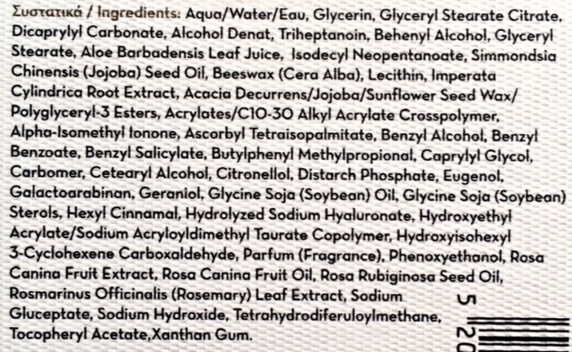 No mineral oils, parabens and silicones. It contains Wild Roses oil (provides a soft and smooth skin), Vitamin C (repairs skin damage) and hyaluronic acid (retains moisture in the skin and fights wrinkles).