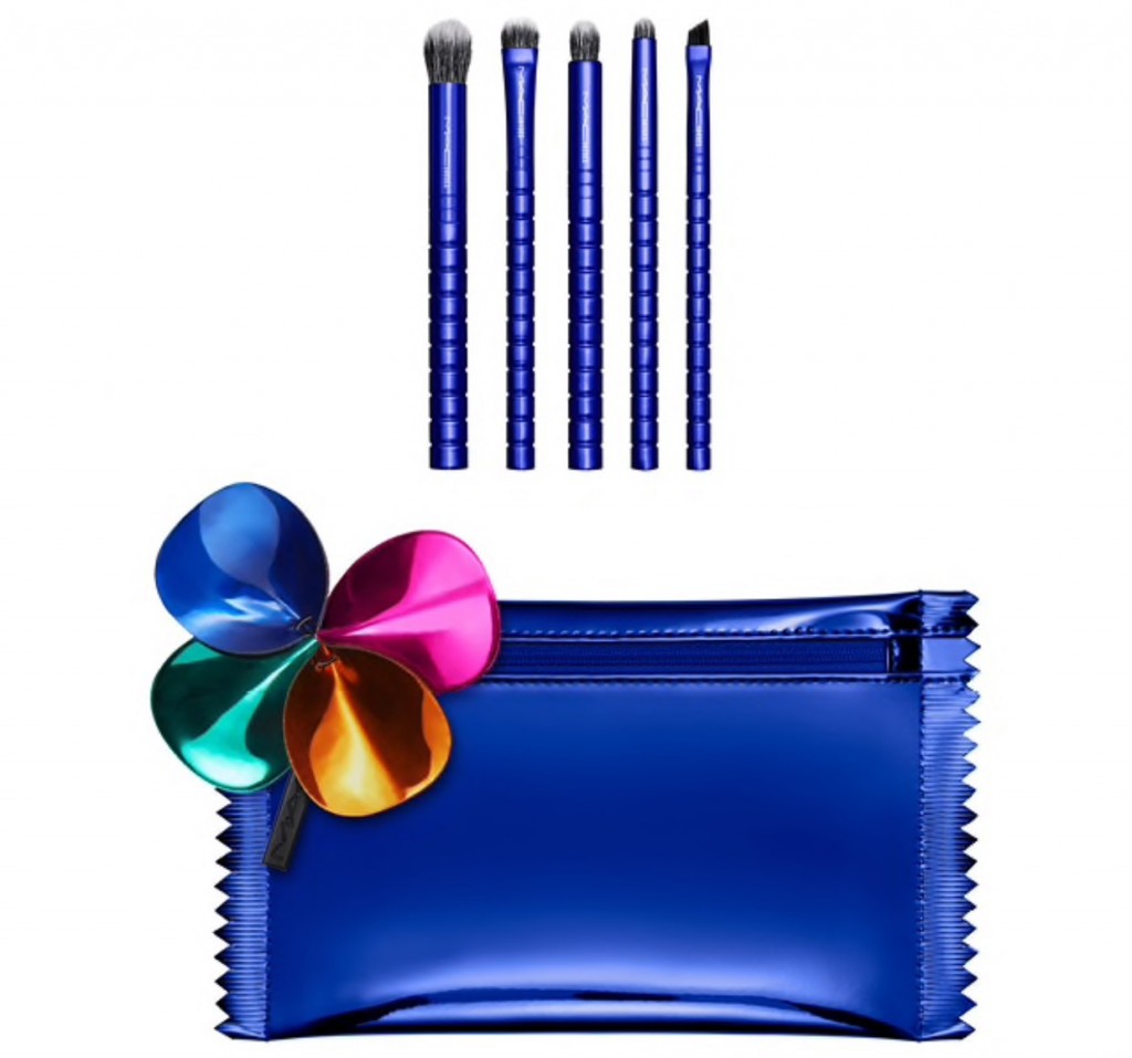 Een kit met vijf mini metallic wrapped borsteltjes voor je ogen, in een metallic blauwe clutch. Brush Party Eyes € 49,50.