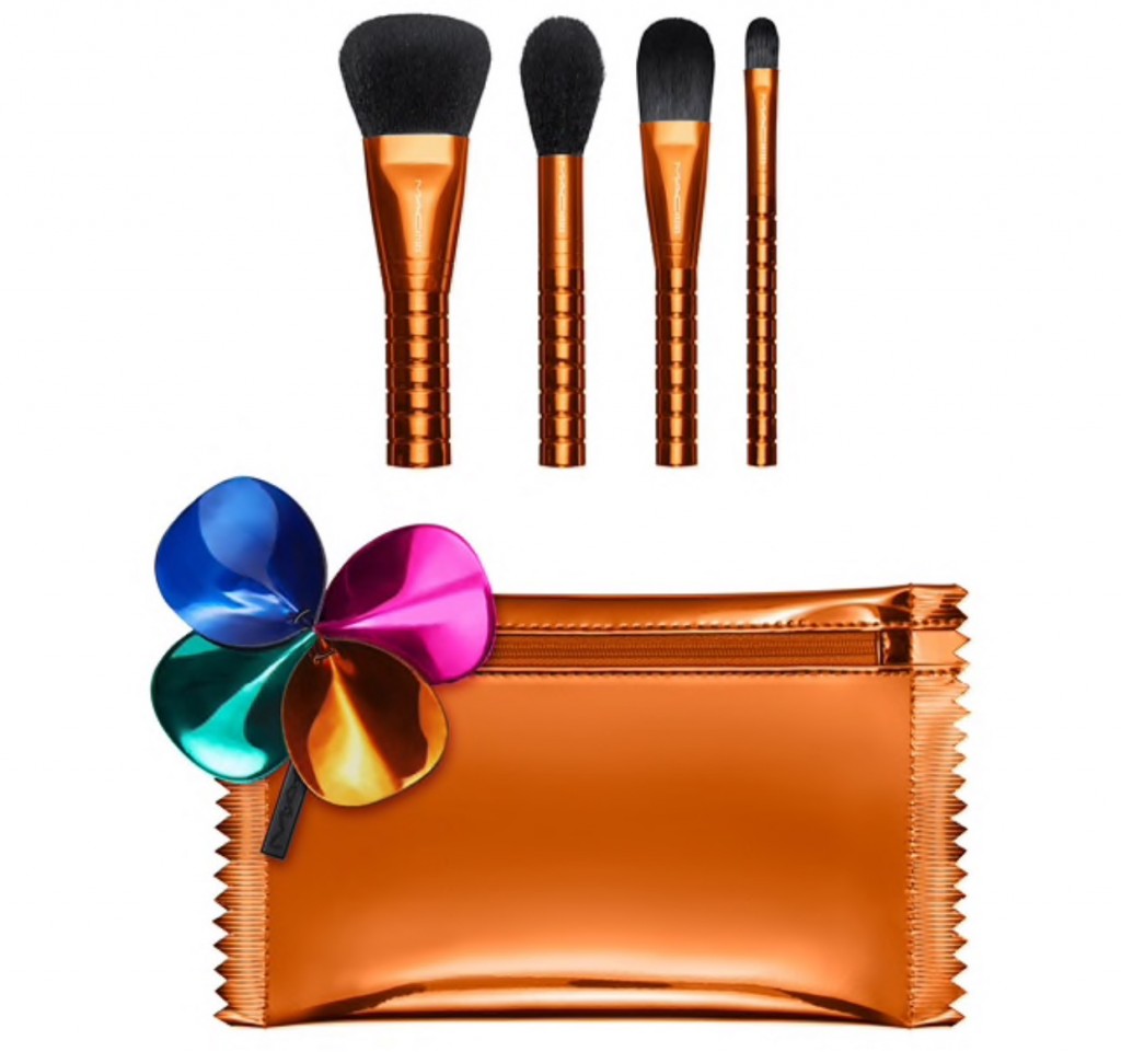 Een kit met vier mini metallic wrapped borsteltjes voor je gezicht, in een metallic oranje clutch. Brush Party Face € 49,50.