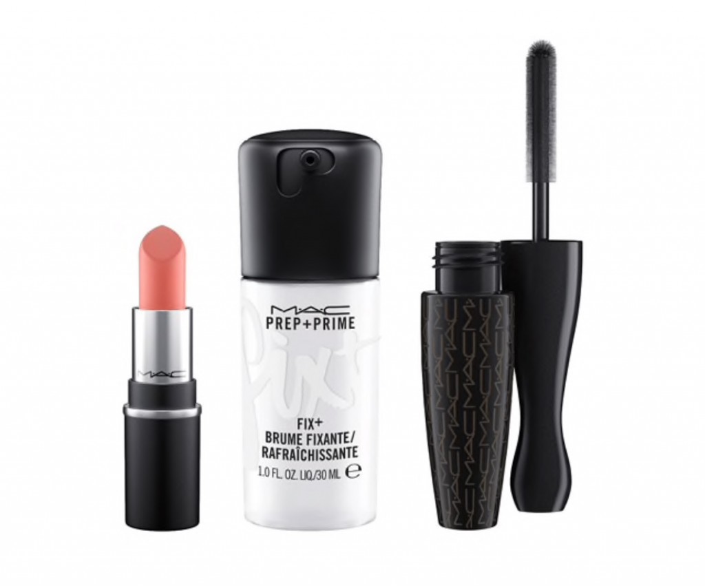 Een set met mini-versies van Prep + Prime Fix +, In Extreme Dimension 3D Black Lash en Lipstick in ‘Velvet Teddy‘, een matte diepe toon beige. All Stars Kit € 29,50.