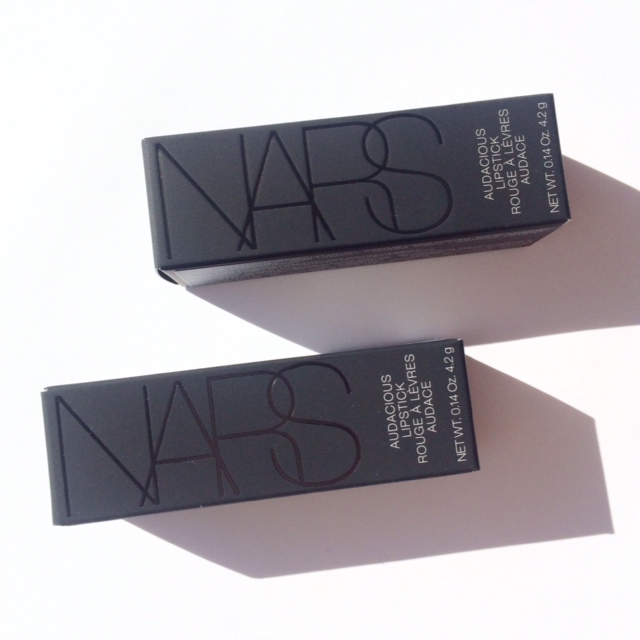 The Nars Audacious lipsticks come in a black package with large black NARS letters on it.