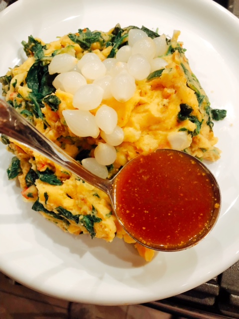 Deze snelle stamppot is een recept van de Albert Heijn. Naast de spinazie zit er knapperige groenten in en de jus is een dikke stroop-ui-mosterdjus.