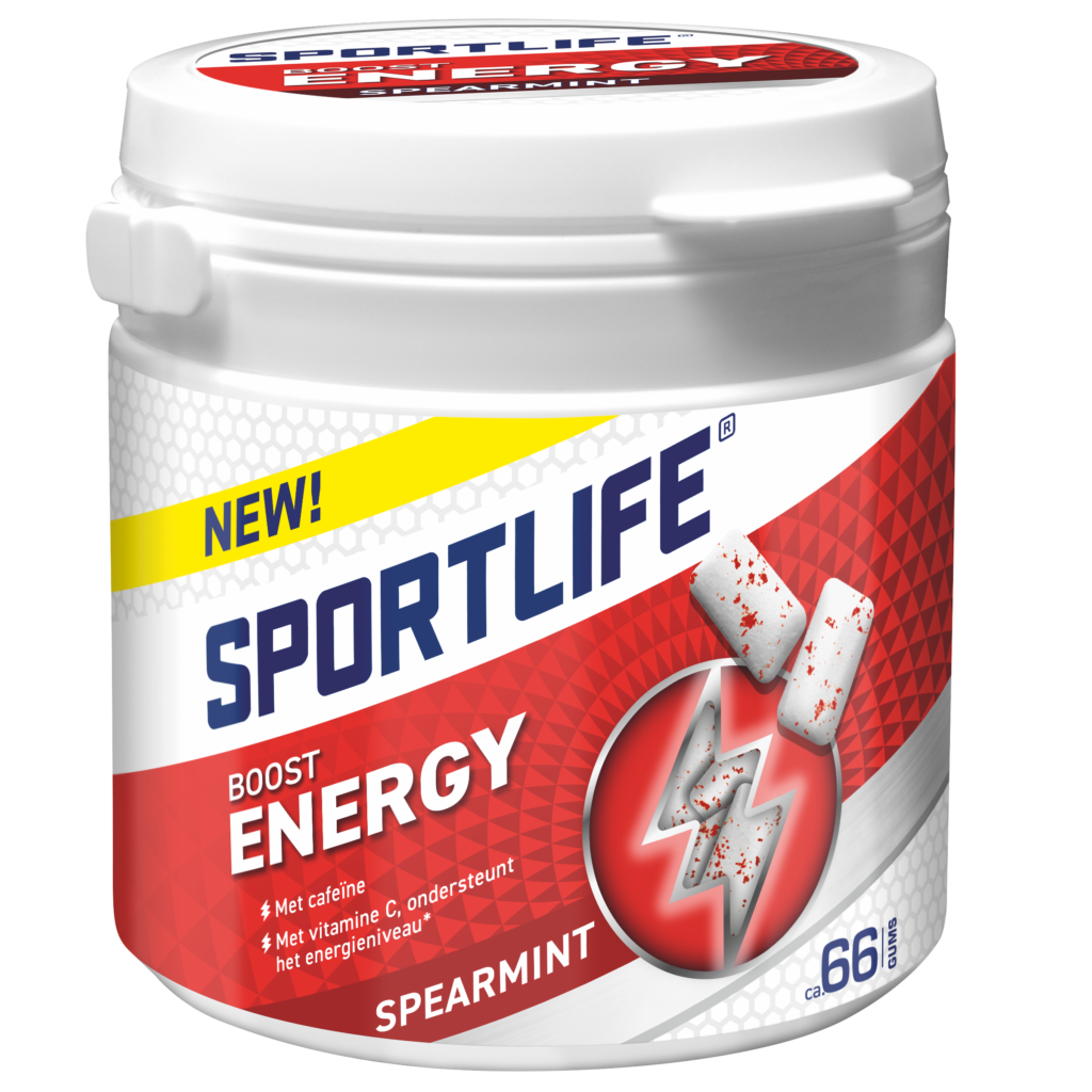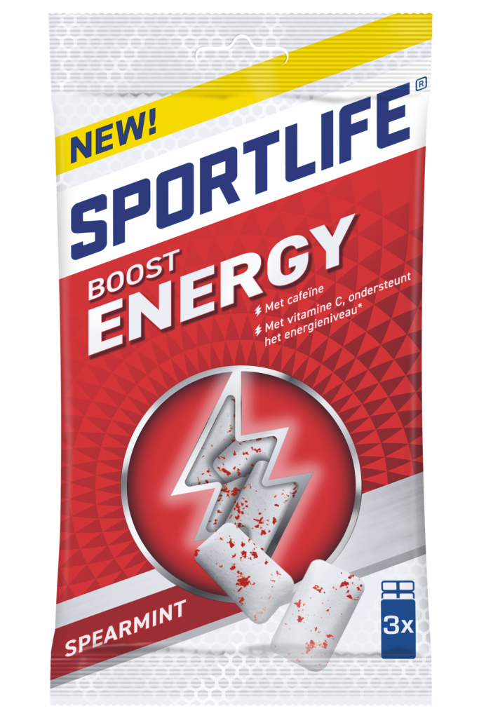 SPORTLIFE BOOST ENERGYSPORTLIFE BOOST ENERGYEnergie is belangrijk voor alles wat we doen, hoe heerlijk is het om eindeloos veel energie te hebben? Sportlife Boost Energy geeft je de frisse kick die je nodig hebt! Aan deze heerlijke spearmint gum is cafeïne en vitamine C toegevoegd; vitamine C ondersteunt je energieniveau. Voor een slow start in de morgen na weer een korte nacht met de kids; een after lunch dip of een flinke autorit voor de boeg! 2 gums bevatten 15% van de dagelijkse aanbevolen hoeveelheid en ongeveer net zoveel cafeïne als 1/3 kopje koffie. Kauw minimaal 20 minuten op 2 kauwgompjes.