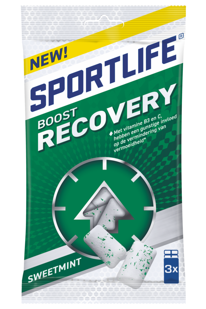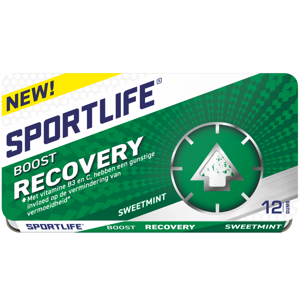 Een goed herstel is minstens net zo belangrijk als het vlammen zelf. Sportlife Boost Recovery met sweetmint smaak bevat vitamines B3 en C; deze hebben een gunstige invloed op de vermindering van vermoeidheid. Even de batterij opladen, bijkomen na het werk om een welverdiende vakantie in te gaan of herstellen van een sportprestatie op maat! Twee gums bevatten 15% van de dagelijks aanbevolen hoeveelheid vitamine B3 en C; kauw minstens 20 minuten op 2 kauwgompjes.