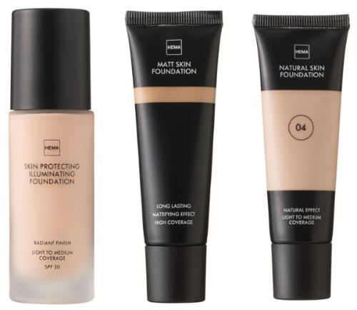 Omdat HEMA weet dat elke huid en de gewenste verzorging hiervan anders is, worden er vier type foundations geïntroduceerd: de Skin protecting illuminating foundation, de Matt skin foundation, de Natural skin foundation en de Full coverage foundation.