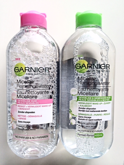 Garnier Micellair Reinigingswater, beide varianten zijn opgegaan. Review hier. Beide reinigen de huid goed inclusief oogmake-up, het micellair water met de roze dop is voor de gevoelige huid en verzacht de huid, het micellair water met de groene dop is voor de gevoelige en gemengde huid, deze kalmeert en bevat matterende deeltjes tegen het glimmen van de huid.