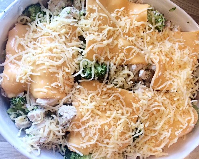 Bovenop gaan een aantal plakken cheddarkaas en daar overheen wat geraspte kaas.