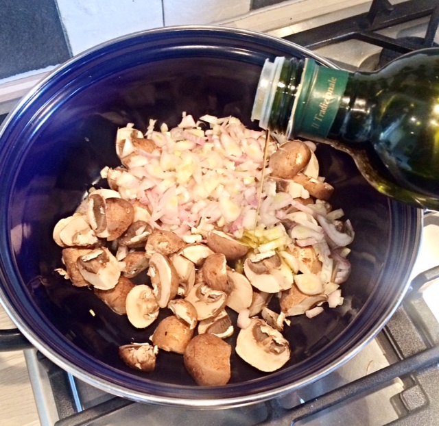 Ik snipper de sjalotjes, snijd de champignons in stukjes en pers het teentje knoflook. Dit gaat allemaal in een grote braadpan met een flinke scheut olijfolie, ik gebruik olijfolie van Olitalia, extra vergine.