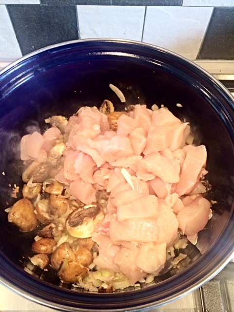 De kipfilets snijd ik in stukjes en gaat ook in de pan bij de sjalotjes, champignons en knoflook. Voor de smaak doe ik zout in de pan, peper erbij is ook lekker, maar daar zijn mijn kinderen niet zo verzot op dus dat skip ik.