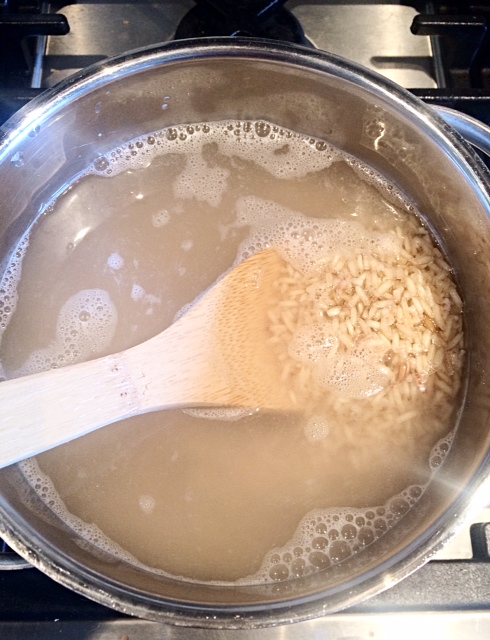 Ik kook de zilvervliesrijst volgens de verpakking en tegelijkertijd kook ik de broccoli beetgaar.