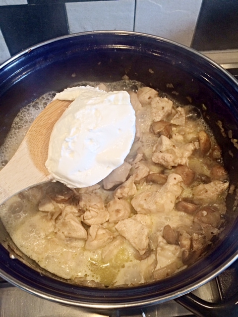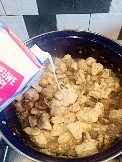 Ik doe een scheut melk bij de kip, ui, champignons en knoflook.