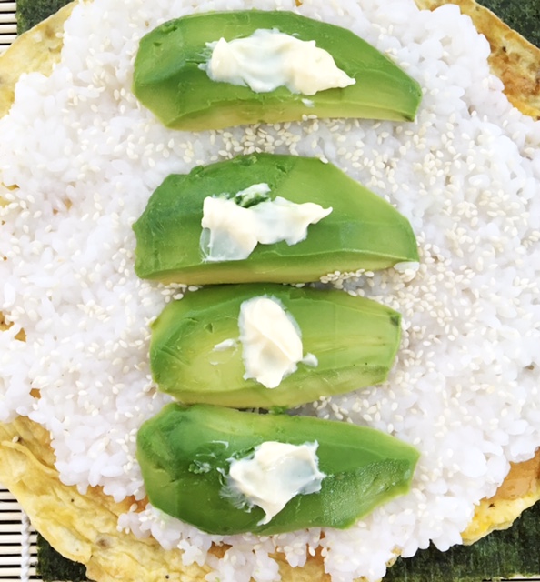 - Doe de stukken avocado op de rijst met een klein beetje knoflookmayonaise.