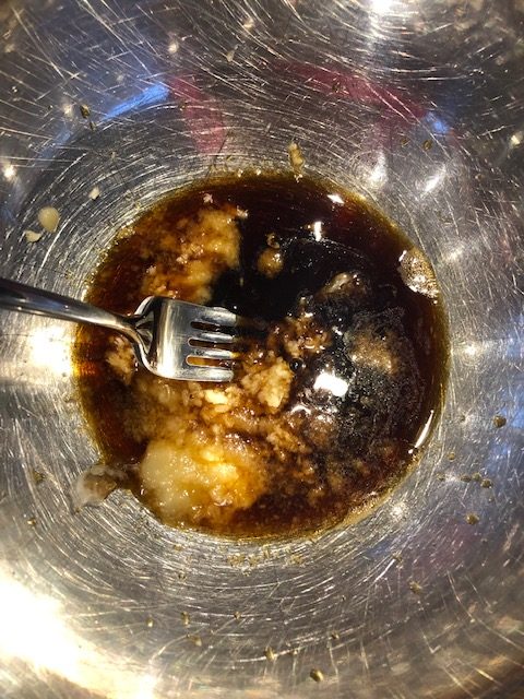 - Klop in een kleine kom de sojasaus, de 3 geperste teentjes knoflook, bruine suiker en gember bij elkaar; zet dit even opzij.