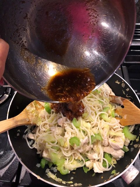- Voeg het sojasaus mengels toe aan de noodels en roer alles goed door.