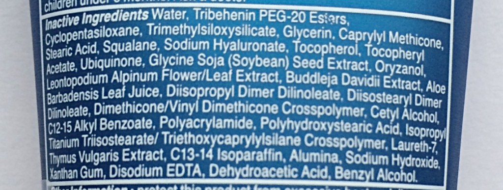 Active Ingredients: Titanium Dioxide 8%; Other Ingredients: Active Ingredients: Titanium Dioxide 8%; Other Ingredients: Water, Tribehenin PEG-20 Esters (skin conditioning agent/thickener), Cyclopentasiloxane, Trimethylsiloxysilicate (silicone slip agents), Glycerin (skin-repairing ingredient), Caprylyl Methicone (skin conditioning agent), Stearic Acid, Squalane (emollients), Sodium Hyaluronate (skin-repairing ingredient), Tocopherol, Tocopheryl Acetate (vitamin E/antioxidants), Ubiquinone, Glycine Soja (Soybean) Seed Extract, Oryzanol, Leontopodium Alpinum Flower/Leaf Extract, Buddleja Davidii Extract (antioxidants), Aloe Barbadensis Leaf Juice (water-binding agent), Diisopropyl Dimer Dilinoleate (emollient), Dimethicone/Vinyl Dimethicone Crosspolymer (silicone film-forming agent), Cetyl Alcohol, C12-15 Alkyl Benzoate (thickeners), Polyacrylamide (film-forming agent), Polyhydroxystearic Acid (thickener), Isopropyl Titanium Triisostearate/Triethoxycaprylylsilane Crosspolymer (polymer-based texture enhancer), Triethoxycaprylylsilane Crosspolymer (binding agent), Laureth-7 (emulsifier), Thymus Vulgaris Extract (antioxidant), C13-14 Isoparaffin, Alumina (thickeners), Sodium Hydroxide (pH adjuster), Xanthan Gum (thickener), Disodium EDTA (chelating agent), Dehydroacetic Acid, Benzyl Alcohol (preservatives).