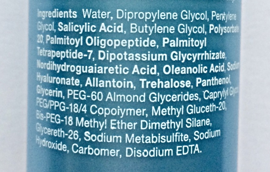 Water, Dipropylene Glycol, Pentylene Glycol (slip agents and penetration enhancers), Salicylic Acid (beta hydroxy acid exfoliating agent), Butylene Glycol (slip agent), Polysorbate 20 (emulsifier) Palmitoyl Tripeptide-1, Palmitoyl Tetrapeptide-7 (cell-communicating ingredients), Dipotassium Glycyrrhizate (anti-irritant), Nordihydroguaiaretic Acid (antioxidant), Oleanolic Acid (anti-irritant), Sodium Hyaluronate (skin-repairing ingredient), Allantoin (anti-irritant),Trehalose (skin-repairing ingredient), Panthenol (skin-conditioning agent), Glycerin (skin-repairing ingredient), PEG-60 Almond Glycerides (emulsifier), Caprylyl Glycol (skin-conditioning agent), PEG/PPG-18/4 Copolymer (solvent), Methyl Gluceth-20, Bis-PEG-18 Methyl Ether Dimethyl Silane (skin-conditioning agents),Glycereth-26 (emollient thickener), Sodium Metabisulfite (stabilizer), Sodium Hydroxide (pH adjuster), Carbomer (gel-based thickener), Disodium EDTA (chelating agent).