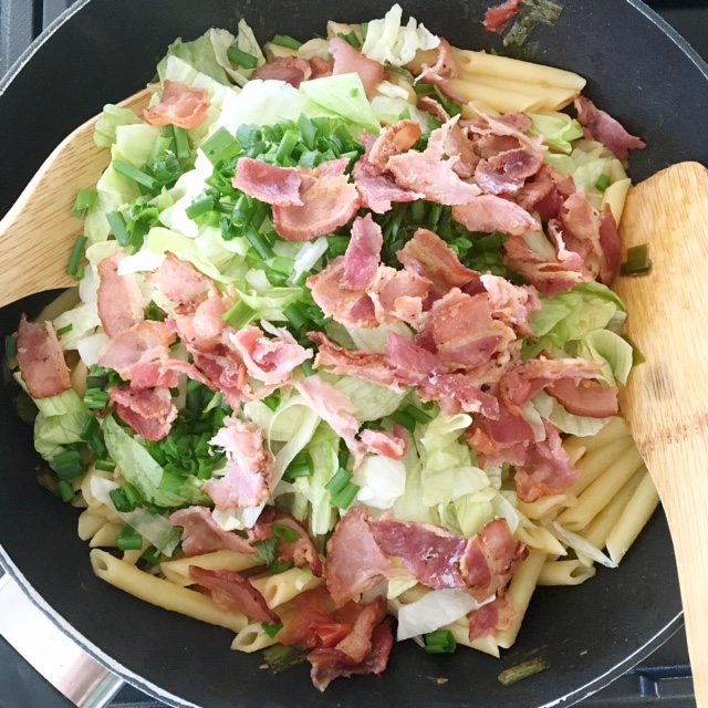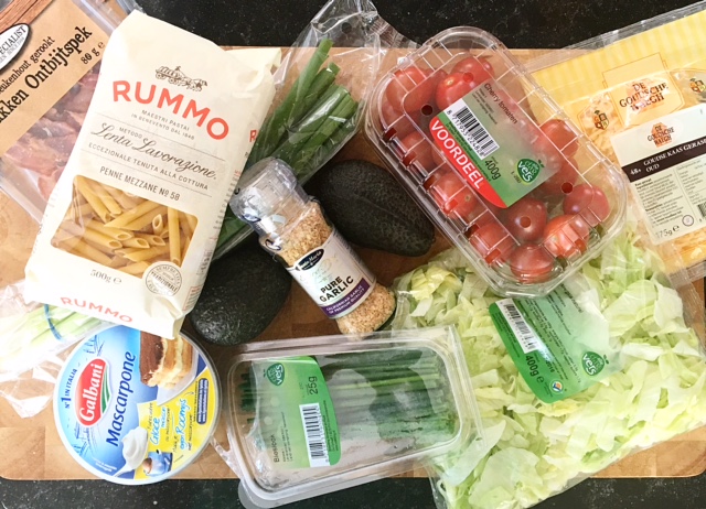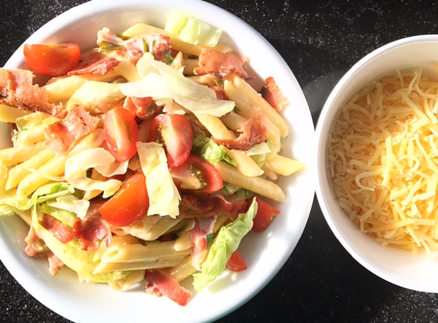Het ziet er in ieder geval lekker uit! De hoofdingrediënten (bacon, sla en tomaat) zitten er in maar daarnaast heb ik nog een aantal ingrediënten toegevoegd voor een goed gevulde pastasalade.