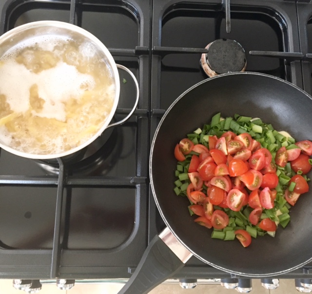 Kook de pasta in ruim water met wat zout. Snijd de bosui in ringen en halveer de cherry tomaatjes. Roerbak tegelijk de bosui met de tomaatjes.
