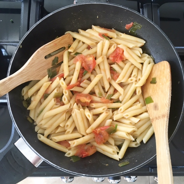 Nadat de pasta is gekookt volgens de verpakking voeg je deze vervolgens bij de ui en tomaten. Roer de mascarpone door de pasta.
