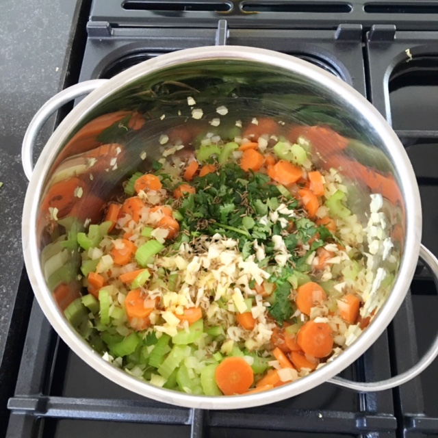 Verwarm de kokosolie in een (soep) pan en voeg daar de gesneden ui, selderij en wortels aan toe. Roer door totdat de ui glazig is.