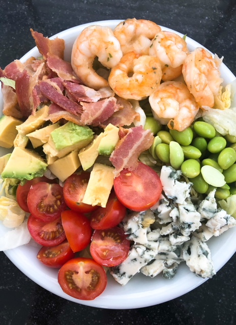 De salade is gemakkelijk te maken omdat bijna alles koud is. Alleen de garnalen moet je nog even bakken in olie met 2 teentjes knoflook. De bacon heb ik voorgebakken gekocht maar kun je natuurlijk ook zelf bakken.