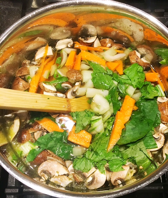 Na alle oliebollen, hapjes en drankjes van de afgelopen dagen is het begin januari weer tijd voor wat gezond eten op tafel. Ik ben gek op zelfgemaakte soep en eet eigenlijk nooit soep uit blik. Dit recept heeft een Aziatisch tintje want waar anders ter wereld snappen ze gezond eten beter. Het recept is een variant op mijn soortgelijke Recept Noedelsoep dat wat milder van smaak is, onderstaand recept is wat pittiger vanwege de kruidnagel en chilipepers. Ik laat tegenwoordig mijn boodschappen thuisbezorgen en helaas waren de shiitakes op en heb ik gewone champignons moeten gebruiken. Ook had ik grote wok garnalen besteld in een pak van 300 gram, maar nu heb ik er een pakje van 100 gram in gedaan.