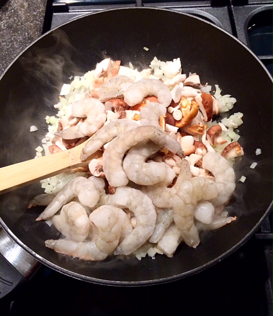 Snijd de paddestoelen in stukjes en voeg ze samen met de garnalen toe aan het ui/knoflook mengsel.