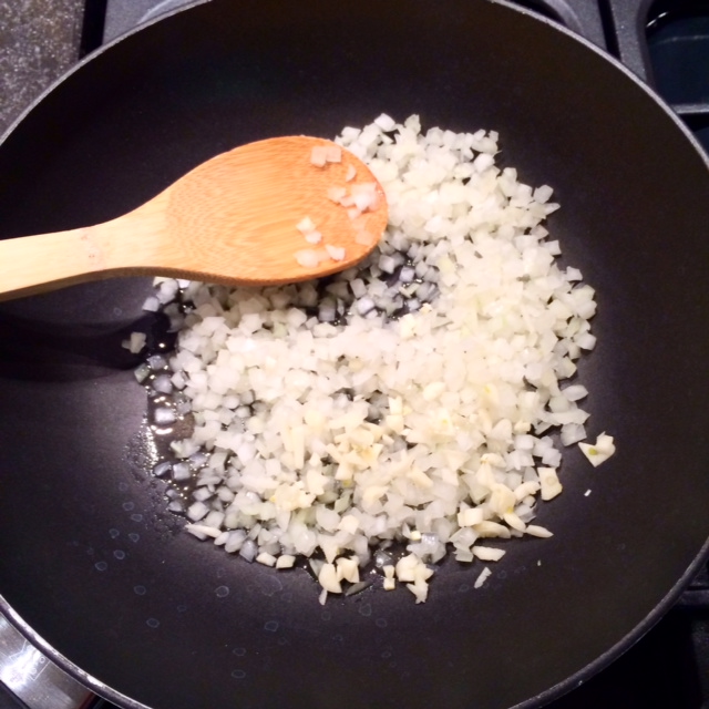 Hak de twee knoflook teentjes fijn en bak ze samen met de gesnipperde ui even kort aan in olijfolie.
