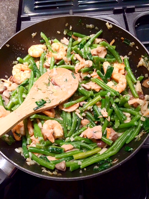 Voeg als laatste de sperziebonen toe en knip een beetje dille boven het gerecht fijn, roer alles goed door. Giet de pasta af.
