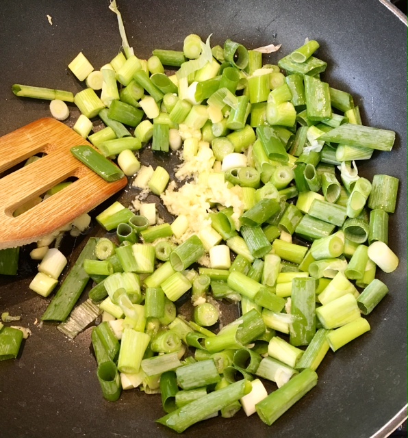 • Squeeze the garlic cloves, cut the spring onions and ginger into small pieces and fry briefly in olive oil and 1 tablespoon soy sauce.